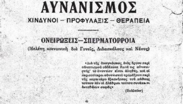 Σας παρουσιάζουμε σήμερα το βιβλίο ενός Έλληνα ιατρού που εκδόθηκε το 1927 και το οποίο θα μπορούσε να χαρακτηριστεί ως το “απόλυτο εγχειρίδιο για τον αυνανισμό”. Κρίνοντας εκ των υστέρων η επιστημονική κοινότητα φυσικά θα διαφωνεί με τα γραφόμενα, αλλά έχει ενδιαφέρον να δούμε τι πίστευαν οι γιατροί τότε. Το βιβλίο έχει τίτλο: “ ΑΥΝΑΝΙΣΜΟΣ- κίνδυνοι- προφύλαξις- θεραπεία. Μελέτη κοινωνική δια γονείς, δασκάλους και νέους”.